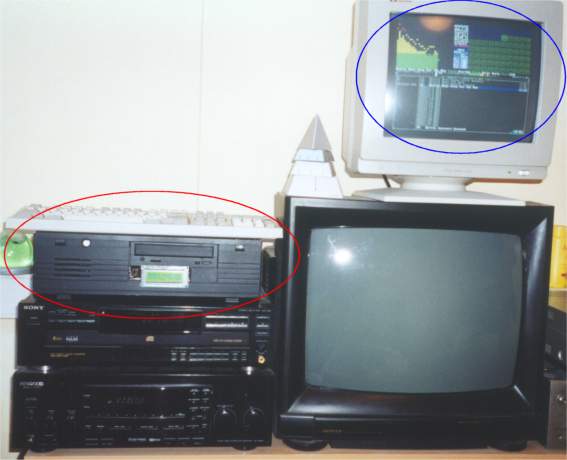 July 2000: I got my hands on an ISA raiser-card and an ISA sound card, so everything fitted into the desktop case now. I painted the desktop casse black to make it a bit look like a stereo-component.