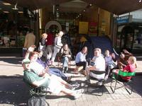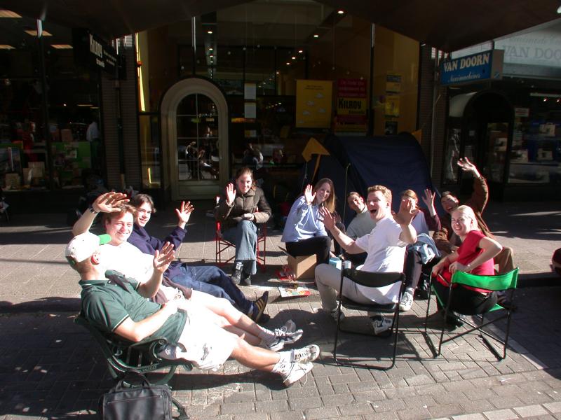 Dave, Esther en 8 andere gelukkigen voor de deuren van de nieuwe vestiging van reisburo Kilroy Travels in Rotterdam